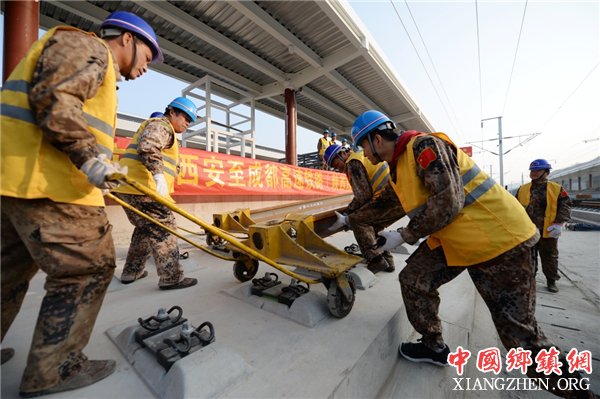 施工人员在西成高铁陕西段宁强南站进行铺轨作业(2月28日摄)。新华社记者李一博 摄