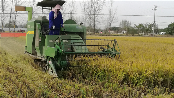 收割机正在收获籼粳杂交再生稻