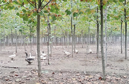 河北柏乡县龙华乡后渤海农业公园内树林中养殖的鸭子。 刘 慧摄