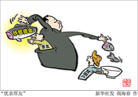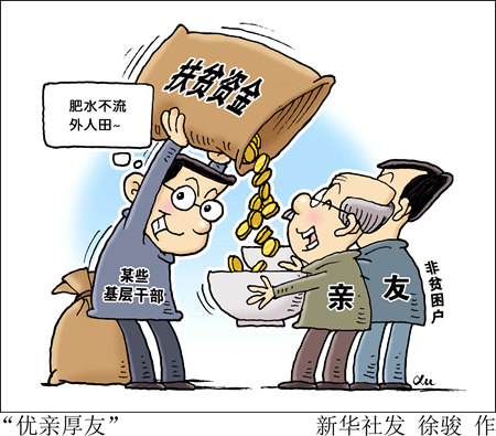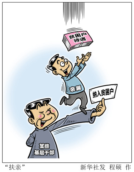 扶贫变为“扶亲”“扶权” 在眉县汤峪镇,一位村民告诉记者,两年来,村里关于贫困户的认定资格以及扶贫款的使用等问题,一直存在质疑和争议。 这位村民介绍,她家种植的猕猴桃去年只卖了2000元,没有被纳入贫困户,但村里有销售猕猴桃收入数万元的村民,仍在享受贫困户待遇。 据了解,有村委会工作人员将自己认定为贫困户,享受危房改造优惠政策盖完新房后,于今年再选择退出。多位村民说,很多贫困户其实并不是真的贫困,都多多少少和村委会干部沾亲带故,甚至有个别今年才退出的贫困户,原来都有私家车。 眉县纪委成立8个监督检查组深入全县8个镇街122个村暗访调查。今年5月,眉县纪委接到线索,称横渠镇土岭村六组组长于留敏将自己的女婿董会宝作为危房改造户上报,并让其享受危房改造资金2万元,而董会宝是在2010年才建成三间砖混结构的房屋。经过调查确认,纪委认定该线索反映的情况属实,并给予于留敏党内严重警告处分,并收缴了相关违纪资金。 眉县纪委审理室主任李伟说,从目前查办的案件来看,扶贫腐败很多都是因为农村的人情关系而滋生的,有的基层干部扶贫成了“扶亲”“扶权”。 有基层干部说,有些村民仅仅有临时性的打工收入,就会被认定为非贫困户,有些干部将自己的亲友通过户口上的拆分,让人均收入降至贫困线以下,享受相关政策。