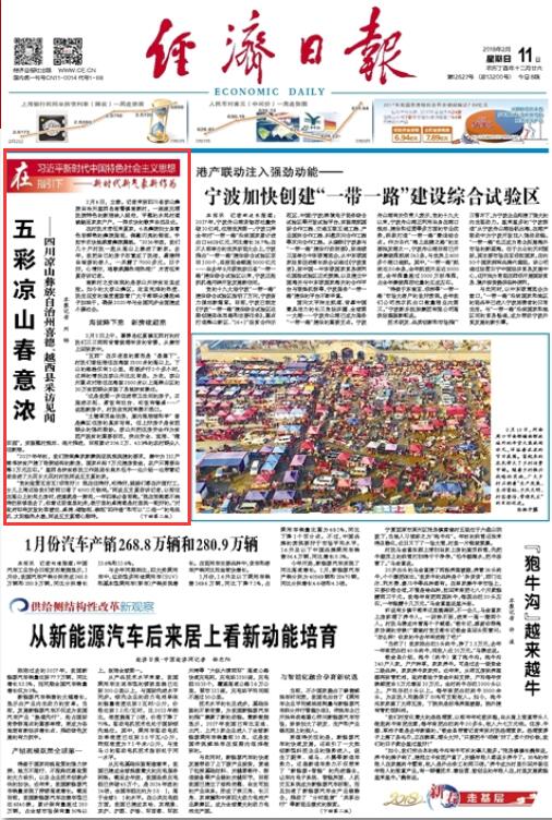 图为《经济日报》2月11日头版头条截图。 以下为报道原文: 2月4日,立春。记者来到四川省凉山彝族自治州越西县南箐镇南新村,一座座充满民族特色的新居映入眼帘,平整的水泥村道蜿蜒至家家户户,一阵欢快的歌声由远及近。 在村民木苦伍来莫家,6名彝族妇女身着色彩鲜艳的彝族服饰,佩戴闪亮的银饰,手拉手欢快地跳着彝族舞蹈。“2016年底,我们几十户村民一起从高山上搬进了新家。去年,我把自己的房子布置成了民宿,靠接待自驾游的客人,一共赚了7000多元。日子好,心情好,唱歌跳舞热闹热闹!”木苦伍来莫告诉记者。 南新村之变体现的是凉山州扶贫攻坚成效。如今的大凉山彝区,攻坚克难的热度、民生巨变的温度激励着广大干部群众撸起袖子加油干,确保2020年与全国同步全面建成小康社会。 海拔降下来 新房建起来 2月3日上午,喜德县红莫镇瓦西村的村民们三三两两背着装满年货的背篓,从集市上回到家中。 “瓦西”在汉语里的意思是“悬崖下”,村民们曾经居住在海拔2500米的高山上,下山的路程仅有3公里,却要步行2个多小时,这样的情况在凉山州比比皆是。为此,凉山州重点对居住在海拔2500米以上高寒山区的30万贫困群众实施了易地扶贫搬迁。 “这是我第一次住进带卫生间的房子,衣服进衣柜、煮饭有灶台、吃饭有餐桌……”说起新房子,村民吉克阿来赞不绝口。 “土墙草顶垒空房,屋内混居猪和羊”曾是彝区住房的真实写照,住上好房子是贫困群众的强烈期盼。凉山州把住房安全作为贫困户脱贫的重要标志,突出安全、宜居、“微田园”,实施整村规划、连片推进,目前累计206.2万、43.9%的农村群众入住新居。 “2017年年初,我们按照彝家新寨统征统规统建的要求,集中为151户精准扶贫户建了轻钢结构的新房,国家补贴7万元建房资金,农户只需要自筹2万元左右。”越西县扶贫移民工作局局长曲木伍牛一边介绍一边带着记者走进了大花乡大花村村民阿说五支莫的家。 “党的政策瓦吉瓦(非常好)!现在住得好,吃得好,娃娃们都在外面打工,女儿上周还给我们老两口寄了4000元钱呢。”阿说五支莫告诉记者,以前住在高山上的泥土房时,进屋就是一脚泥,一年四季必备雨靴。“现在雨靴都不晓得扔到哪里去了,你看这卧室里的床,客厅里的桌椅都是村里统一配好的。”对政府即将发放的取暖灶、桌椅、储物柜、碗柜“四件套”和可以“二选一”的电视机、太阳能热水器,阿说五支莫满心期待。 曲木伍牛告诉记者,2017年大花乡共在9个集中点建设彝家新寨6069套,2018年全村建房任务将全面完成并按照农旅结合的模式发展旅游产业。 道路修好了,房子建好了,新的生活暖了人心。 产业引进来 钱包鼓起来 2月3日下午,村民冷祥芳还在喜德县光明镇新联村邡达现代农业产业园的大棚里忙活,一辆卡车停在大棚外,冷祥芳和工友们忙着将新培育的西瓜苗装箱运走。 “我是今年刚到这里打工的,以前跟着爱人在外面跑工地,太辛苦了。现在离家近,每天和邻居结伴过来,有说有笑,挣得也不少。”冷祥芳说。 2016年4月开园至今,邡达现代农业产业园前后为近9000名村民提供了就业机会。除了就近务工,村民们还以土地入股和出租两种方式获得收益。“土地入股,村民每年可以收到每亩地1000元的租金,还能拿到产业园利润的10%作为分红,去年每亩地分红600元。”邡达现代农业产业园负责人高云告诉记者。 凉山州贫困地区气候恶劣、土地贫瘠,加之生产方式落后,广种薄收、经营粗放,少数地方仍处于“靠天吃饭”“靠天养畜”状态。为此,凉山州将产业扶贫作为主攻方向,预计到2020年,凉山州将建成林业产业基地2700万亩,全州农民人均林果业面积达到6亩;建成马铃薯基地240万亩、水果130万亩、蔬菜130万亩、中药材19.5万亩,年出栏优质草食畜390万头(只),全州农民农牧业收入达到6000元以上。 2月4日上午,雪后初晴,趁着阳光明媚,越西县东方农业发展有限公司总经理曹伟在甜樱桃种植基地忙个不停。“我们正在赶着建避雨大棚,有了大棚就不怕果子裂了。”聊到基地建设的初衷,曹伟十分感慨。“这是国企入凉产业扶贫的项目,我是一名党员,深感自己是带着责任和使命来到越西的。”曹伟告诉记者,公司计划在5年内发展5万亩甜樱桃,实现产值5亿元。 有了龙头带动,越西县政府还免费提供种苗,县农牧局提供种植技术,在一系列政策的带动下,老百姓纷纷投入甜樱桃种植中,预计每亩土地将实现1万元收益。 产业富民,“造血”帮扶,脱贫奔小康的路子越来越多。 教育抓起来 希望多起来 为帮助彝区农村孩子过好“语言关”、养成“好习惯”,凉山州通过利用村支部活动室、闲置村小、彝家新寨活动场所等富余公共资源,大力实施“一村一幼”计划。截至2017年末,凉山州开办村级幼教点3038个,开设班级3900个,招收幼儿11.64万名,聘用上岗辅导员7629人。 越西县大花乡瓦尔村的幼教点设在村支部活动室里。2月5日,10多名彝族小朋友穿戴整齐,端坐在小凳上,老师魏玲正在教他们背儿歌、做游戏。“很多小朋友刚来的时候连普通话都不会说,卫生习惯也不太注意。我们通过‘小手拉大手’,先培养孩子们良好的卫生习惯,再慢慢改变家长们的观念。”魏玲告诉记者。 “3年的努力没有白费,彝区的儿童尤其是女童入学率已经达到100%。2018年,我们计划投入200万元,改善289个村幼教点的基础设施建设,