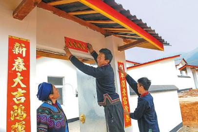 1月10日,昭觉县普诗乡杉树村建档立卡贫困户吉木约日一家,正在新居门前张贴对联。该村50户178名建卡贫困人口全部搬进宽敞明亮的彝家新寨。 本版图片由本报记者尹钢李向雨吴传明衡昌辉通讯员冷文浩摄 |