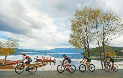 骑行爱好者的车队融入泸沽湖自然风光和人文风情的画卷中。