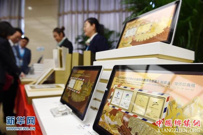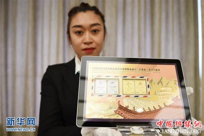 这是见面会现场展示的《北京2022年冬奥会会徽和冬残奥会会徽》邮票纯金、银仿印特许产品(3月21日摄)。新华社记者鞠焕宗摄