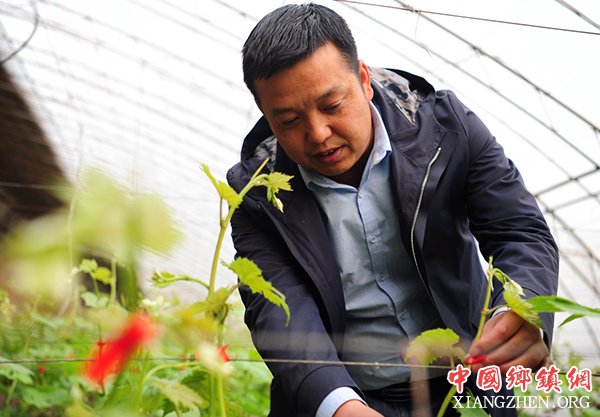 陕西杨凌示范区职业农民李海平在自家大棚内查看葡萄生长情况(3月19日摄)。