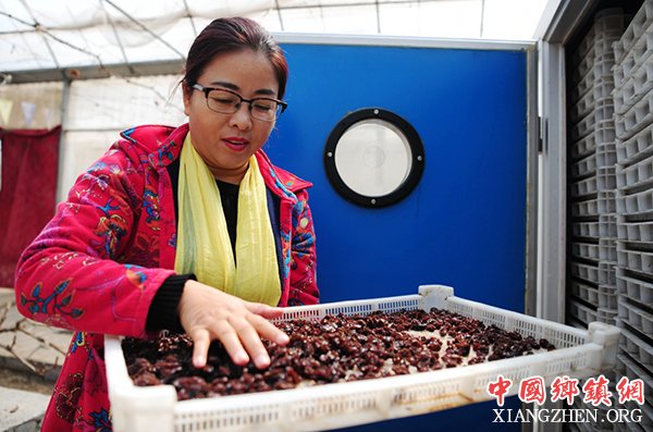 杨育英在自家大棚内查看葡萄干制作情况(3月20日摄)。