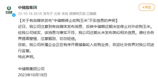 据中储粮集团微博消息,近日,中储粮集团公司注意到有自媒体发布消息,反映中储粮近期决定停止对外收购玉米。经中储粮集团公司核实,该消息与事实不符,中储粮集团公司近期从未发布类似相关信息。请社会各界提高警惕,注意甄别,切勿轻信。 目前,中储粮集团公司所属企业正在有序开展储备轮入收购业务,欢迎社会各界对中储粮集团公司进行监督。