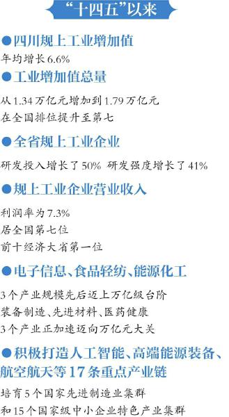 捕风——11月17日,海拔5370米的雪域之巅,东方电气定制化风机在缓缓转动,这是全球在运海拔最高的风电项目。东方电气新能科技(成都)有限公司四川事业部项目经理赵子威难掩激动:“攻克上万次参数校准难关,打败强紫外线与9级阵风‘拦路虎’,东方风电高原型机组完美实现零失误并网!”四川优势产业的“柱”,又多了一根。 追影——四川大学华西医院,2个月内,长虹中玖闪光研制的e-Flash放疗设备已为5例皮肤癌患者开展治疗。这一以秒速对肿瘤进行“定向爆破”的医疗“黑科技”,用5年时间从实验室走向临床试验阶段。四川向新搭建的“梁”,又往前一步。 建设现代化产业体系,巩固壮大实体经济根基,被放在党的二十届四中全会部署的战略任务首位。工业大省四川,以新型工业化作为主引擎,不断垒砌现代化产业体系的四梁八柱。 速度、强度和精度,成为衡量四梁八柱的标尺。 速度 “十四五”以来,全省规上工业增加值年均增长6.6% 速度,在持续加快。“今年上半年搬入首批设备,正全力推进产线运营的准备工作。”11月,京东方科技集团股份有限公司首席执行官冯强透露的消息,更新了全省迄今投资体量最大的单体工业项目、国内首条第8.6代AMOLED生产线进度条。 一年多前,该项目正式封顶,而从开工到封顶,仅用了183天。 另一头,四川亚度家居有限公司板材生产车间内的滚筒输送线上,大小、长短、厚薄不同的板材快速运转,扫描材料上的二维码后“各到各家”,进入开料、封边、打孔等工序。 家具厂内,一场生产变革正悄然发生:依托工业互联网平台,生产效率提升20%,物料损耗降低8%。 由点及面。“十四五”以来,四川聚焦“有效投资、有根产业、有持续税源”狠抓制造业项目投资,全省累计实施制造业项目超过1.5万个,带动制造业投资超2万亿元;深入实施制造业智能化改造数字化转型行动,加快推动企业“上云用数赋智”,近两年通过集中攻坚,全省规上工业企业数字化转型覆盖率提升20个百分点以上。 项目建设和向新向智的速度跃升,让工业规模和质效稳步提升。 “十四五”以来,全省规上工业增加值年均增长6.6%,工业增加值总量从1.34万亿元增加到1.79万亿元,在全国排位提升至第七。 抓优势——电子信息、食品轻纺、能源化工3个产业规模先后迈上万亿级台阶,装备制造、先进材料、医药健康3个产业正加速迈向万亿元大关。 谋未来——布局25条产业新赛道,加快培育机器人等新兴产业以及第六代移动通信(6G)、量子科技等未来产业,人工智能、生物技术、卫星网络、无人机等重点领域保持两位数以上增长。 强度 17条重点产业链都在“上强度”,全球近一半的高端柔性屏在川生产 强度,在持续加大。整车日产量稳定在1100台以上,这是四川领克汽车制造有限公司当下的生产强度。今年前三季度,仅领克汽车一家企业,新能源汽车产量就达14.69万辆,同比激增626%。 今年1—10月,四川汽车制造业增加值同比增长17.3%,全省汽车产量达91.5万辆;而全省去年全年的汽车产量,则是89万辆。特别是今年前三季度,四川新能源汽车、汽车用锂离子动力电池等相关产品产量,同比分别增长1.7倍、55.0%。 除了新能源汽车及动力电池,全省17条重点产业链都在“上强度”。 一个切片是,2025世界显示产业创新发展大会开幕式上,总投资额157.4亿元的13个新型显示产业合作项目集中签约,涉及显示材料、器件、模组、内容制作、智能终端等产业链各环节。2025年上半年,四川新型显示产业在建亿元以上项目数量达47个,同比增长近50%。 上强度带来硬实力——全球50%的笔记本电脑、10%的智能手机在成渝地区制造,全球近一半的高端柔性屏在四川生产。 而拥有全部41个工业门类的四川,声名在外的还不只是新型显示:川酒产销量均占全国白酒行业的“半壁江山”;全国60%的核电产品、50%的轧钢设备和大型电站铸锻件、40%的水电机组都由四川制造,发电设备产量位居世界第一…… 锻长补短,强者恒强。去年以来,四川着力推动重点产业建圈强链,发挥创新链、产业链、资金链、人才链融合评价体系牵引作用,持之以恒加快推动重点产业做强能级、做大规模、做优生态。 如今,柔性显示、超高性能永磁材料、核电设备、高端化药制剂等一批标志性产品加速涌现,比亚迪、沃尔沃、惠科等产业链重大项目建设跑出加速度,在中大型无人机、智能传感器、氢能装备等领域已形成独特优势。 精度 从企业到集群,微观主体活力澎湃 精度,在持续不断打磨。翻开最新的世界500强企业名单,3家川企上榜,通威集团有限公司在列。就在3年前,这一衡量和比较全球大型企业的榜单中,还没有四川制造业企业的身影。 80个国家先进制造业集群中,四川5大集群入选,覆盖电子信息、能源装备、生物医药等领域,入选数量并列全国第四;而在国家级中小企业特色产业集群中,成都占了8席,入选数量并列副省级城市第一。 几份名单,都指向四川新型工业化最精细的刻度——从企业到集群,微观主体活力澎湃。 作为激光电视屏幕中不可或缺的光学元件,一层菲涅尔透镜,由几万个比头发丝还细的微透镜组成。屏幕越大、透镜的尺寸越大,激光雕刻等环节的难度越高。成都菲斯特科技有限公司董事会秘书袁建波透露,从100英寸到120英寸,再到今年推出的150英寸菲涅尔光学屏幕,他们已将国外的竞争对手远远甩在身后。 “十