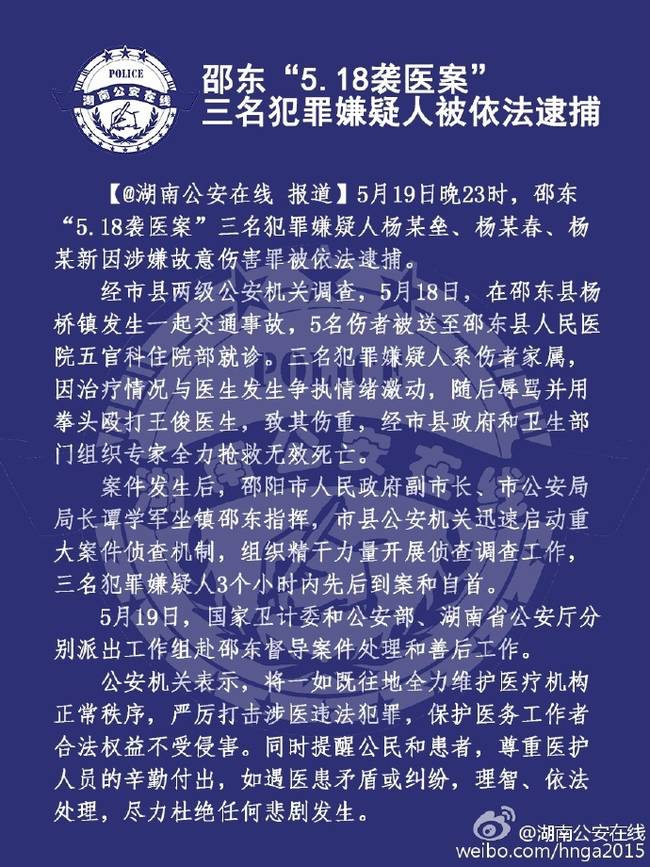 湖南公安在线官方微博对该事件的情况通报 据《潇湘晨报》报道,2017年1月30日,邵阳市中级人民法院以故意伤害罪判处杨海垒等三人4年至12年不等的有期徒刑。 湖南万和联合律师事务所律师李健介绍,根据《刑法》第二百三十四条规定,故意伤害致人死亡的处十年以上有期徒刑、无期徒刑或者死刑。根据本条规定,故意伤害致人死亡最高可判处死刑。 李键表示,本案中,因杨海垒等三人的故意伤害行为,最终导致被害人王俊抢救无效死亡。我国《刑法》规定了罪行相适应原则,即刑罚的轻重,应当与犯罪分子所犯罪行和承担的刑事责任相适应。一审判决中刑期最高的杨海垒判处十二年有期徒刑,虽然在量刑幅度内,但结合被害人王俊死亡这一严重后果来看,邵阳市人民检察院提出抗诉是有法可依的。 近日,湖南省高级人民法院在邵东县法院开庭审理此案。目前,该案正在进一步审理中。 翻页查看《潇湘晨报》对于事件的完整报道: 2016年5月18日中午,邵阳市邵东县杨桥镇,邵东县泉水村村民杨绍平驾车发生交通事故,致其妻子及三个子女受伤,伤者随即被送到邵东县人民医院救治。当班医师曾佩荣、邓有林、王俊负责对伤者诊治。伤者被送医后不久,杨绍平三名亲属杨海垒、杨新春、杨立新闻讯赶到医院。 邵阳市卫计委的情况说明显示,伤者中有两名男孩,分别为2岁和4岁。事发当天12时43分,两人分别由邓有林、曾佩荣接诊,接诊时两人神志清楚,只有面部局部青紫,不需要清创处理,予以头部CT检查即可。两人于当天13时40分完成头部CT检查返回病房。家属认为应该给两个孩子立刻进行清创处理,便找到医生王俊。 目击者反映,当时王俊正在做手术,患者家属要求王俊停下正在进行的手术,为他们的孩子清创。王俊告诉他们,“小孩的情况不算严重,即使要做手术也要等这台手术结束之后。”但杨立新认为医院对孩子救治不及时,在医院吵闹并与王俊发生争执、扭打。杨新春双手抱住王俊,杨立新击打王俊头顶一拳,杨海垒击打王俊左胸部两至三拳。王俊当即被打倒在地,头撞到地上,还反弹了一下。 目击者称,当时王俊神志丧失,呼吸停止,大小便失禁,医院医护人员闻讯后,立即对王俊进行抢救。之后,因伤势过重,王俊于5月18日17时15分抢救无效死亡。 记者了解到,当时40岁的王俊是家中独子,从衡阳医学院毕业之后,已在邵东县人民医院工作了18年。在同事看来,王俊为人亲切、工作耐心细致,家庭也非常圆满。王俊的妻子是一名老师,两人育有一儿一女,事发时,他的小儿子才刚刚10个月大。 2016年5月18日晚,湖南省公安厅通报,案件发生后,邵东县公安局立即启动重大刑事案件应急预案,抽调50多名精干警力全力展开侦破和抓捕工作,抓获犯罪嫌疑人杨新春、杨立新;5月18日19时,另一名犯罪嫌疑人杨海垒迫于压力投案自首。 |