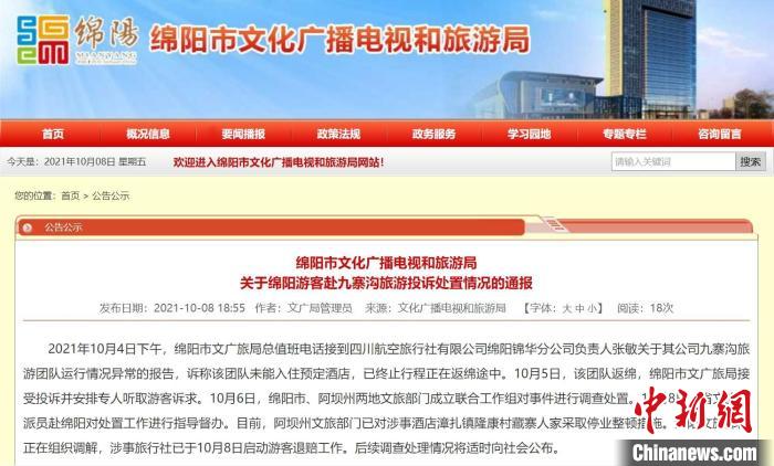 绵阳市文化广播电视和旅游局发布的《关于绵阳游客赴九寨沟旅游投诉处置情况的通报》。网页截图 网页截图 摄 中新网绵阳10月8日电 (记者杨勇)8日,四川省绵阳市文化广播电视和旅游局发布《关于绵阳游客赴九寨沟旅游投诉处置情况的通报》,通报称,四川省文旅厅已派员赴绵阳对处置工作进行指导督办。目前,阿坝州文旅部门已对涉事酒店漳扎镇隆康村藏寨人家采取停业整顿措施。绵阳文旅部门正在组织调解,涉事旅行社已于10月8日启动游客退赔工作。 据媒体报道,由四川航空旅行社有限公司绵阳锦华分公司带领的33人九寨沟旅游团,10月2日一早从绵阳出发,深夜抵达九寨沟后,却被告知旅行社预订的宾馆已经满房,旅游团一行33人被临时安排到一家久未营业的酒店,不仅环境差,床单上有很多污渍,而且还没有热水。10月3日,旅游团一行满怀期待地乘坐大巴前往九寨沟。然而,在距离景区一公里时,导游告知景区游客实在太多,如果排队会等很久,建议先去黄龙景区游玩,当天晚上返回,4日再去九寨沟景区。但从黄龙游玩结束后,又被告知头天晚上入住的酒店没有房间了。在四处寻找酒店时,当地下起了大雨,最后旅游团33人被安排到了一家农家住宿,但住宿环境更差,床上有老鼠屎,卫生间无法使用,只能去公共厕所,放的自来水也是浑浊的,而此时已经是4日凌晨2点多了。4日早上,大部分游客提出提前结束行程返回绵阳,考虑到司机长途驾驶的安全问题,4日晚上在茂县住宿,5日安全抵达绵阳。