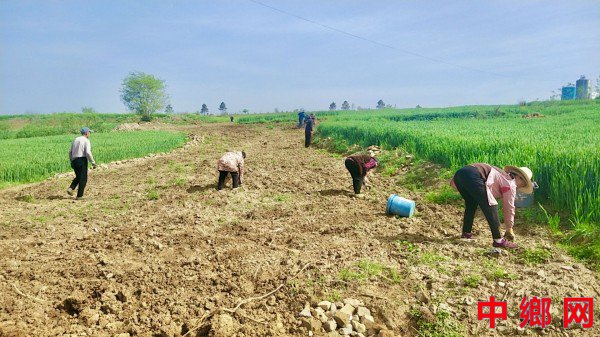 来到武店镇搬井村东边的红山上,入目尽是绿色麦田,碧绿连天,随风、摇曳,但在这片翠绿麦田中间,却有一片30余亩黄色荒地,村支书正带领十多户村民顶着烈日,挥洒汗水,一格一格地播种农作物。