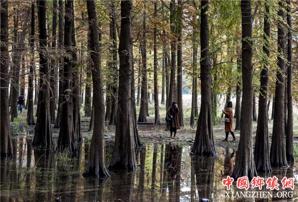 11月26日,游客在浙江省余姚市梁弄镇四明湖畔的池杉林内游玩。