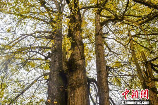 图为千年银杏树披金装。 严东波 摄 11月下旬,在重庆市秀山土家族苗族自治县中溪村,一棵千年古银杏树迎来最佳观赏期,银杏叶黄,景色迷人。该银杏树有1800多年历史,树高40米,树冠覆盖面积达60多平方米。据了解,为更好地保护这棵古树,中溪村村民自发捐资为其盖起了围墙,并修建了纪念碑,还成立有义务护树队。 |