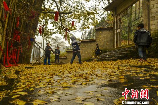 图为银杏树下,村中小孩嬉闹。 严东波 摄