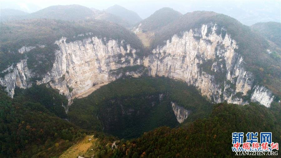 这是11月28日航拍的重庆奉节小寨天坑。小寨天坑位于重庆市奉节县兴隆镇小寨村,坑深666米,是闻名中外的世界地质奇观。 新华社发