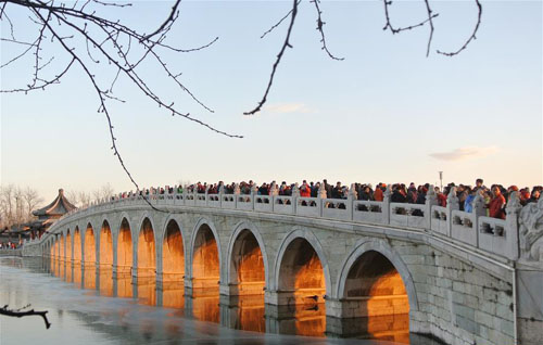 12月6日,游客在颐和园欣赏十七孔桥“金光穿洞”美景。当日日落时分,北京颐和园十七孔桥出现“金光穿洞”美景,吸引许多游客前来观赏。 新华社记者马志红摄