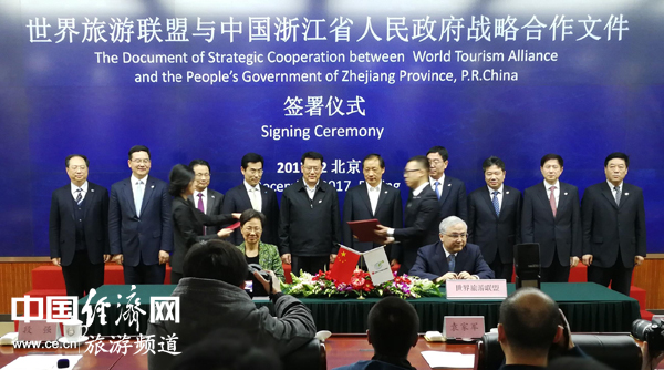 12月17日,世界旅游联盟(WTA)与中国浙江省政府战略合作文件签字仪式在北京举行。经济日报-中国经济网记者 裴小阁摄影 据悉,联盟此前曾在全国范围内,从旅游产业发展优势和地理区位优势明显的城市中遴选联盟总部落户地,东中西部优秀旅游城市代表西安、成都、广州、杭州、厦门等五城市曾作为世界旅游联盟(WTA)被列为候选城市。根据国际惯例,世界旅游联盟组委会本着公正公开透明的原则,严格按照《世界旅游联盟总部选址投票规则》,组织评委会委员召开总部选址工作会,进行现场投票、现场清点、当场计票。最终,杭州市以总分第一,成功获选。 根据双方签署的合作文件,世界旅游联盟和浙江省政府将建立紧密合作机制,共同推进联盟总部基地建设和运作,深化国际旅游交流合作,促进浙江旅游产业健康可持续发展。世界旅游联盟将在浙江举办重大国际旅游活动,积极帮助浙江引进国际旅游人才,支持浙江引进大型知名国内外旅游集团总部落户浙江。浙江省政府将做好世界旅游联盟总部落户杭州的相关保障工作。