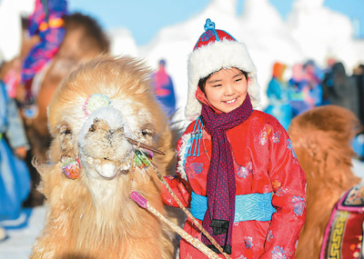 1月9日,内蒙古苏尼特右旗第12届骆驼文化节在赛汉塔拉镇举行。来自鄂尔多斯、呼伦贝尔以及苏尼特和乌珠穆沁草原的牧民带着200多峰骆驼在白雪覆盖的草原上进行骆驼选美、骆驼竞速等比赛。文化节还举行了赛马、搏克等蒙古族传统体育活动。图为一名蒙古族小朋友和骆驼合影。 新华社记者 连 振摄 |