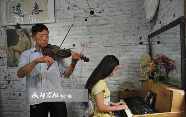 图为2016年8月17日,李铁军父女学音乐。 从泸州市纳溪城区的一条窄巷进入,向着长江方向步行约两公里,就到了李铁军和女儿居住的地方——中国化学工程第七建筑公司退休职工宿舍,被纳溪人称为“下七化建”。小区里古木参天,共有四栋青砖楼房。如今四周都是新小区,这些建于上世纪70年代的楼房,相比之下显得有些破旧。小区居民都是上了年纪的人,整个小区显得十分安静。