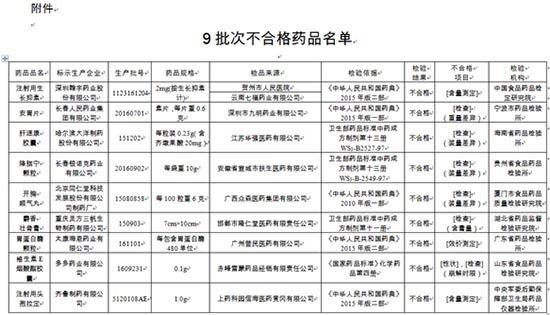 近日,国家食药监总局通告了9批次药品不合格情况,标示为深圳翰宇药业股份有限公司、齐鲁制药有限公司等9家企业生产的9批次药品不合格。 不合格产品的标示生产企业、药品品名和生产批号为: 深圳翰宇药业股份有限公司生产的批号为1123161204的注射用生长抑素,长春人民药业集团有限公司生产的批号为20160701的安胃片,哈尔滨大洋制药股份有限公司生产的批号为151202的肝速康胶囊,长春银诺克药业有限公司生产的批号为20160902的降脂宁颗粒,北京同仁堂科技发展股份有限公司制药厂生产的批号为15080858的开胸顺气丸,重庆灵方三帆生物制药有限公司生产的批号为150903的麝香壮骨膏,太康海恩药业有限公司生产的批号为161101的胃蛋白酶颗粒,多多药业有限公司生产的批号为1609231的维生素E烟酸酯胶囊,齐鲁制药有限公司生产的批号为5120108AE的注射用头孢拉定。 不合格项目包括性状、含量测定、崩解时限、重量差异、装量差异、含膏量、效价测定(详细情况见下图)。对上述不合格药品,相关省级食品药品监督管理部门已采取查封扣押等控制措施,要求企业暂停销售使用、召回产品,并进行整改。(曾璇)