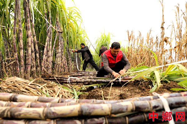 图为近日,在老集村甘蔗种植基地里,党员志愿者在帮助种植户起收甘蔗。