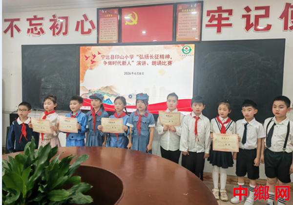 中乡网湖南宁远讯 为传承红色基因,厚植家国情怀,纪念红军长征胜利90周年,4月8日上午,宁远县印山小学举行“弘扬长征精神,争做时代新人”演讲、朗诵比赛。本次活动紧扣“新时代好少年”主题教育要求,参赛选手齐聚赛场,以声传情、以情叙志,共同追忆革命岁月,礼赞英雄征程。