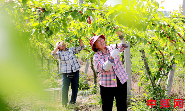 2026年4月19日,在安徽省阜阳市颍东区枣庄镇蒋楼村梨园,村民抢抓晴好天气,加紧为梨树疏果,确保果实品质,为今年梨果丰产丰收打下坚实基础。