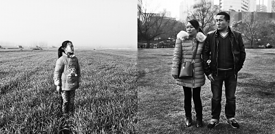 左图:安徽省阜阳市八里河镇9岁的徐如梦站在一片麦田里;右图:徐如梦的父母在上海一处草坪上。母亲已经决定一个人回家乡陪女儿读书。