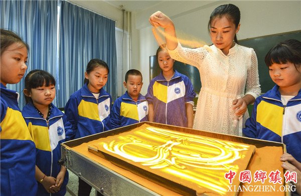 9月5日,在河北省廊坊市第二十三小学,孩子们在观看老师的沙画演示。 新华社记者李晓果摄