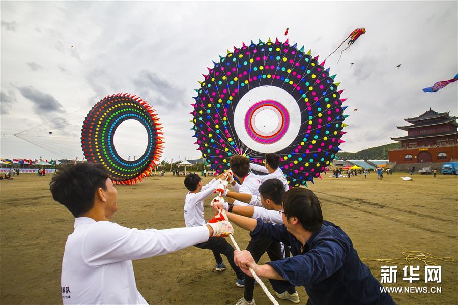 10月14日,参赛选手在风筝比赛活动现场放风筝。