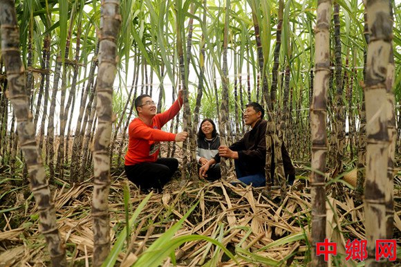 2025年10月12日,在安徽省阜阳市颍东区新华街道杨付村,科技特派员(左一)正在向种植户讲解甘蔗后期管理技术要点。