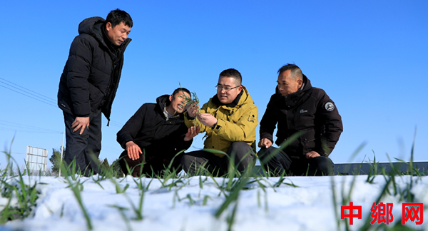 2026年1月22日,在安徽省阜阳市颍东区正午镇王桥村,科技指导员(右二)正在为农户指导小麦雪后田管技术要点。