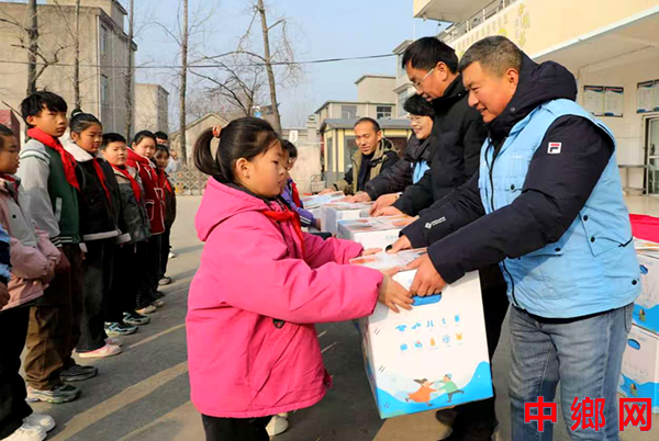 2025年12月31日,工作人员在安徽省阜阳市颍东区枣庄镇中心学校为孩子们发放温暖包。
