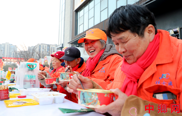 2026年1月24日,在安徽省阜阳市颍州区清河宋街,环卫工人在开心地品尝志愿者送来的腊八粥。