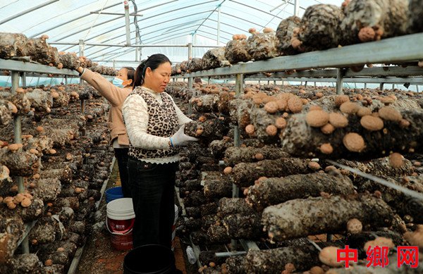 2025年11月15日,安徽省阜阳市颍东区枣庄镇李庄村,村民在大棚内采收香菇。
