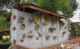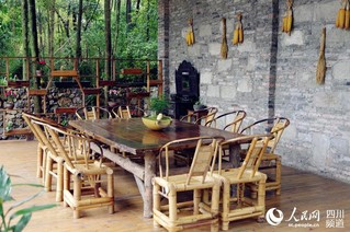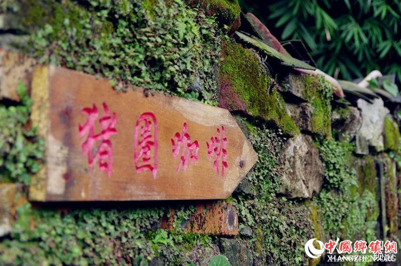家坎院落内竹林环抱,小桥流水,依托良好的院落卫生环境,以竹栅栏和砌石为墙,猪槽点缀为小景,将旧农具、旧家具、旧自行车、废弃树桩等物件进行创意搭配,辅以植物景观,形成了猪圈咖啡馆展示农耕文化、咖啡文化、院落景观等形态,是一处让游客休闲之余品味咖啡浓香的理想之地。(王军 摄)