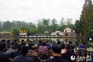 青城湾湿地庄园位于都江堰市柳街镇金龙社区,紧邻成青旅游快速通道,占地320亩,是一家以诗歌国学为主题的陶渊明式农庄。2015年被中国诗歌学会选定为“全国诗歌创作基地”、省国学研究会选定为“实景国学教育基地”,2016年至今接待游客40多万人。图为嘉宾们观看乡土文化展演。(王军 摄) |