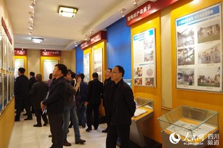 鹤鸣村位于都江堰市柳街镇中部,是全国产权制度改革第一村,也是城乡统筹综合项目示范村。图为嘉宾们参观该村产改展示馆。(王军 摄)
