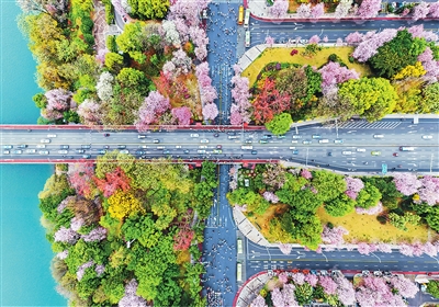 柳州街头,街道旁、公园里、江岸边,层层叠叠的花瓣交织成一条