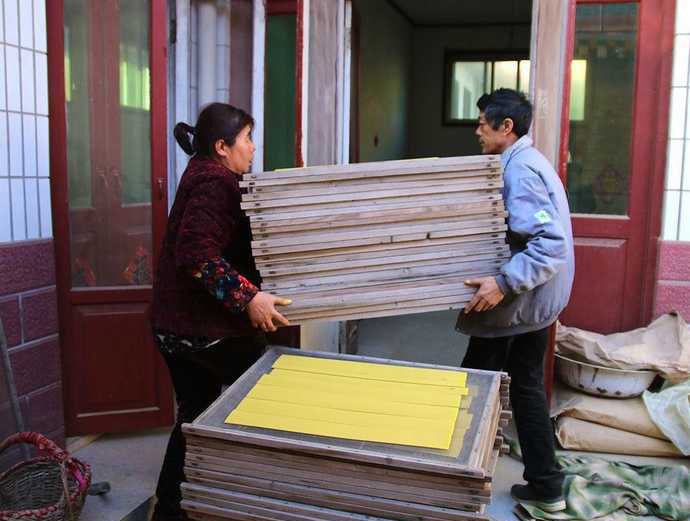 谈绍波夫妻一起把笸箩里的香抬到家中进一步包装加工。