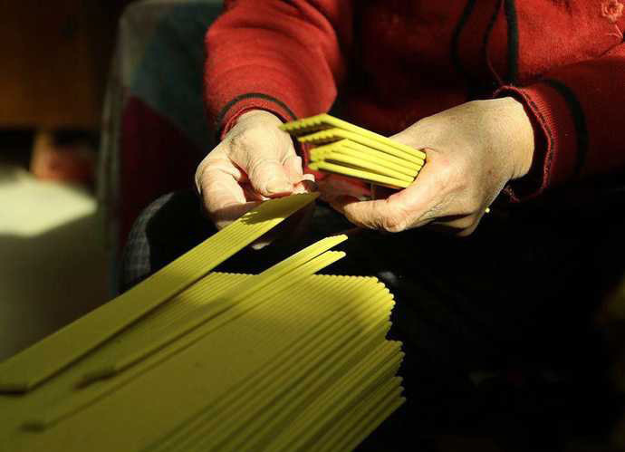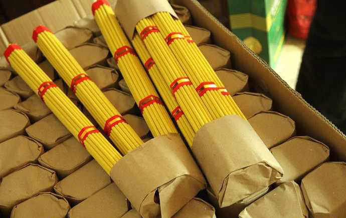 谈师傅告诉笔者,他们村子看似不大,其实是个黄香制作的大产地。以前机械不发达时祖辈们是用双手制香的。如今,虽然机器可以替代以前手工上的挤压和出条等工序,但从配料到晾晒等大部分的工序还要靠手工完成。