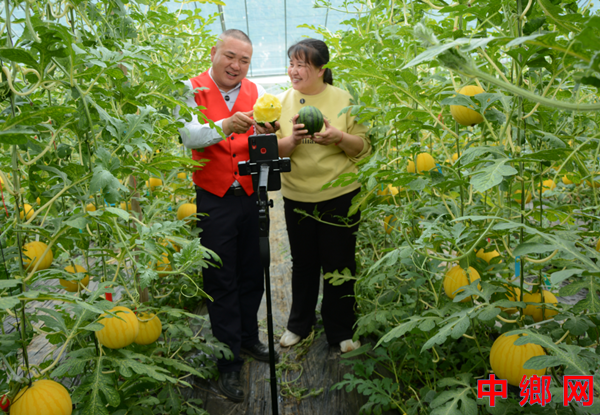 4月15日,河南省内黄县直播达人张文忠和吕志霞正在马上乡赵信村智能大棚产业种植基地帮助吕学伟现场直播销售黄金4号礼品和彩虹礼品西瓜。